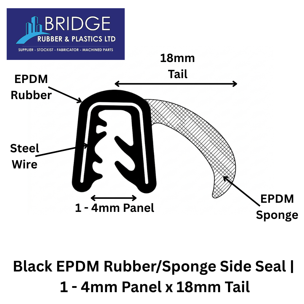 Black EPDM Rubber/Sponge Side Seal | 1 – 4mm Panel x 18mm Tail