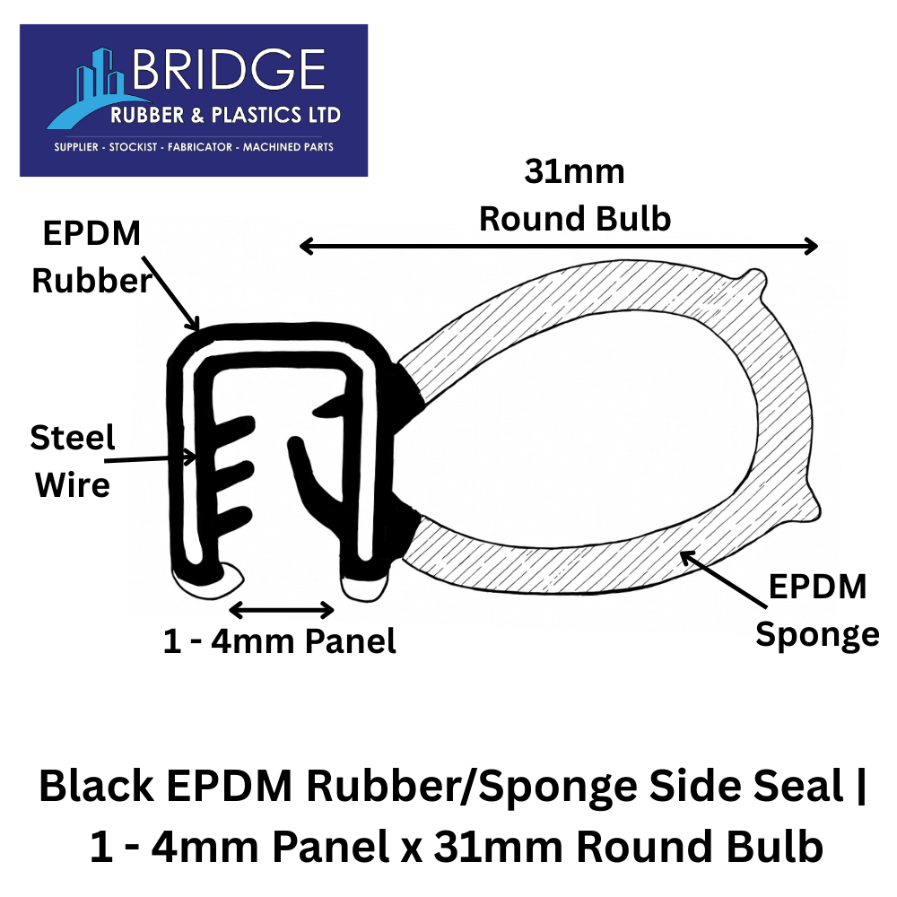 Create a strong, long lasting seal with our Black EPDM Rubber/Sponge Side Seal, designed to fit 1–4mm panel edges and featuring a 31mm round bulb for superior compression and weather resistance. This versatile profile is commonly used as a door seal, boot seal, edge seal, or hatch seal, making it ideal for automotive, caravan, marine, and general sealing applications.