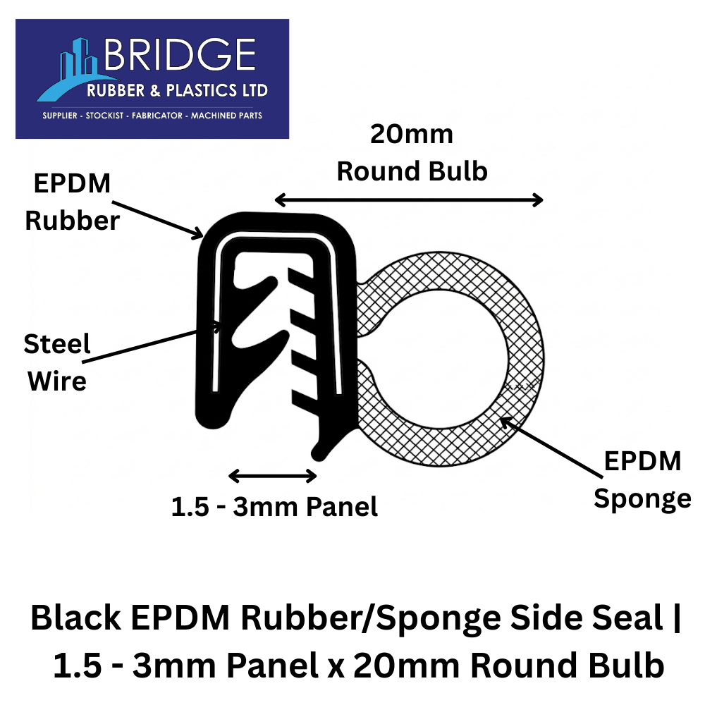 Create a strong, long lasting seal with our Black EPDM Rubber/Sponge Side Seal, designed to fit 1.5-3mm panel edges and featuring a 20mm round bulb for superior compression and weather resistance. This versatile profile is commonly used as a door seal, boot seal, edge seal, or hatch seal, making it ideal for automotive, caravan, marine, and general sealing applications.