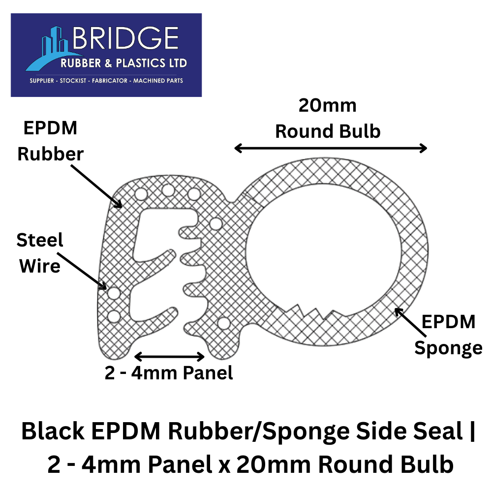 Create a strong, long lasting seal with our Black EPDM Rubber/Sponge Side Seal, designed to fit 2–4mm panel edges and featuring a 20mm round bulb for superior compression and weather resistance. This versatile profile is commonly used as a door seal, boot seal, edge seal, or hatch seal, making it ideal for automotive, caravan, marine, and general sealing applications.