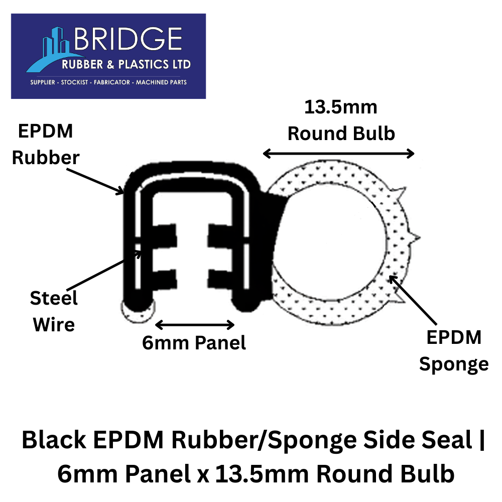 Create a strong, long lasting seal with our Black EPDM Rubber/Sponge Side Seal, designed to fit 6mm panel edges and featuring a 13.5mm round bulb for superior compression and weather resistance. This versatile profile is commonly used as a door seal, boot seal, edge seal, or hatch seal, making it ideal for automotive, caravan, marine, and general sealing applications.