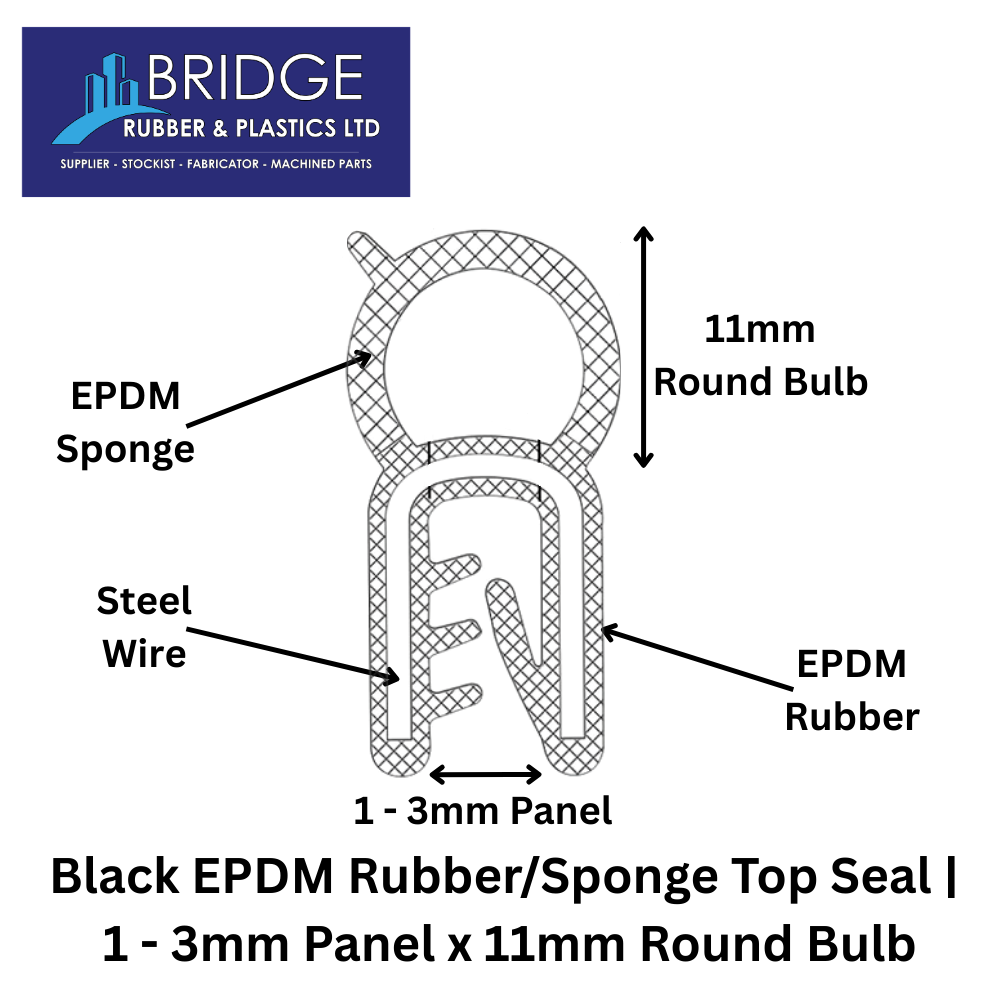 Create a strong, long lasting seal with our Black EPDM Rubber/Sponge Top Seal, designed to fit 1–3mm panel edges and featuring a 11mm round bulb for superior compression and weather resistance. This versatile profile is commonly used as a door seal, boot seal, edge seal, or hatch seal, making it ideal for automotive, caravan, marine, and general sealing applications.