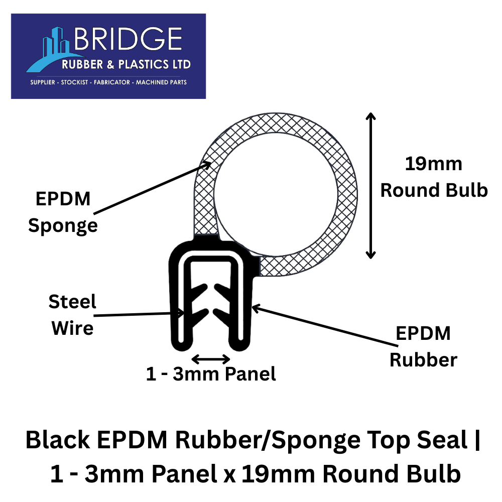 Create a strong, long lasting seal with our Black EPDM Rubber/Sponge Top Seal, designed to fit 1–3mm panel edges and featuring a 19mm round bulb for superior compression and weather resistance. This versatile profile is commonly used as a door seal, boot seal, edge seal, or hatch seal, making it ideal for automotive, caravan, marine, and general sealing applications.