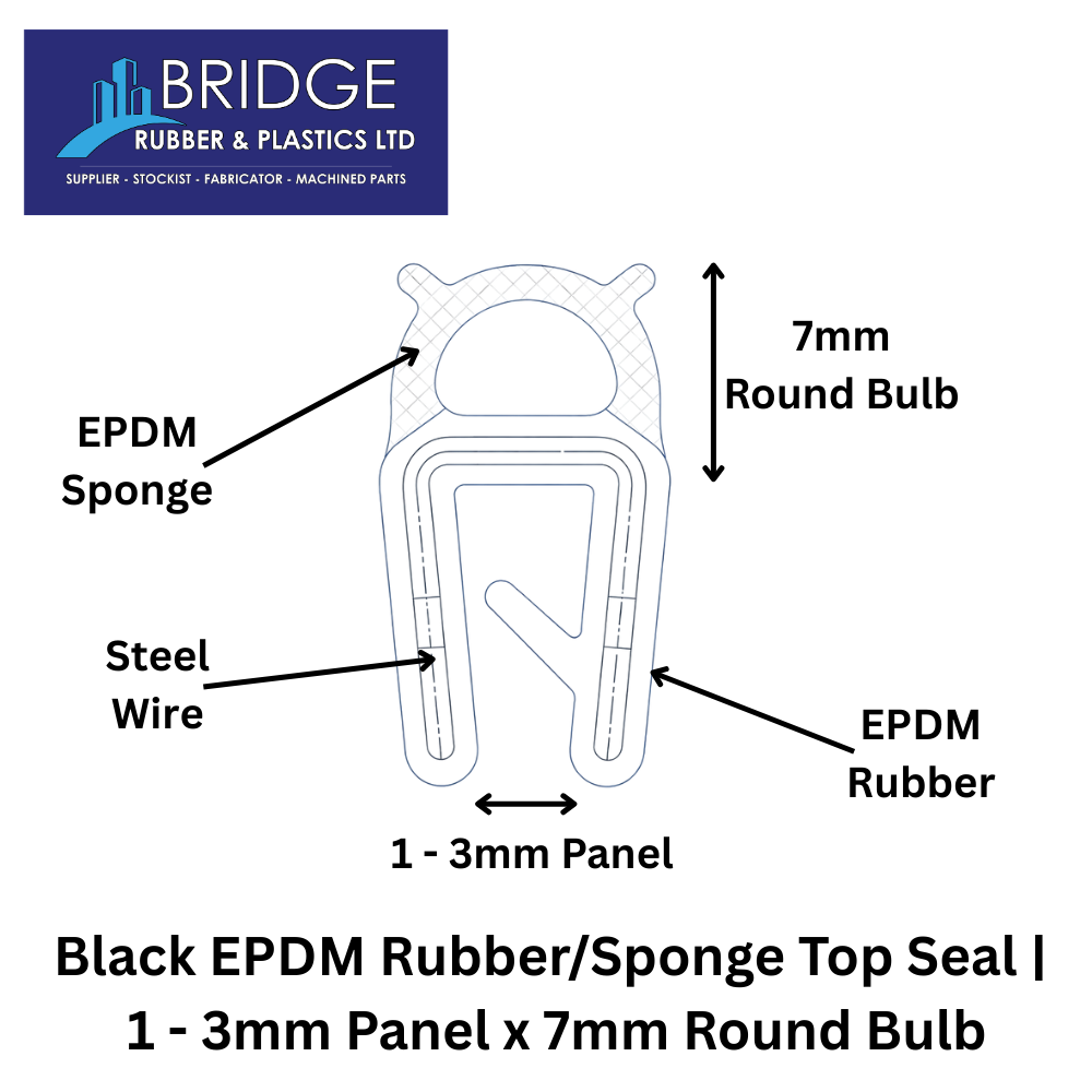 Create a strong, long lasting seal with our Black EPDM Rubber/Sponge Top Seal, designed to fit 1–3mm panel edges and featuring a 7mm round bulb for superior compression and weather resistance. This versatile profile is commonly used as a door seal, boot seal, edge seal, or hatch seal, making it ideal for automotive, caravan, marine, and general sealing applications.