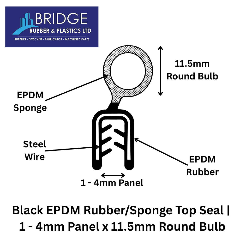 Black EPDM rubber/sponge top seal with 11.5mm round bulb for 1–4mm panels. Ideal as a door seal, boot seal, edge seal, or hatch seal. Provides a tight, weatherproof, vibration damping seal for automotive and general sealing applications.