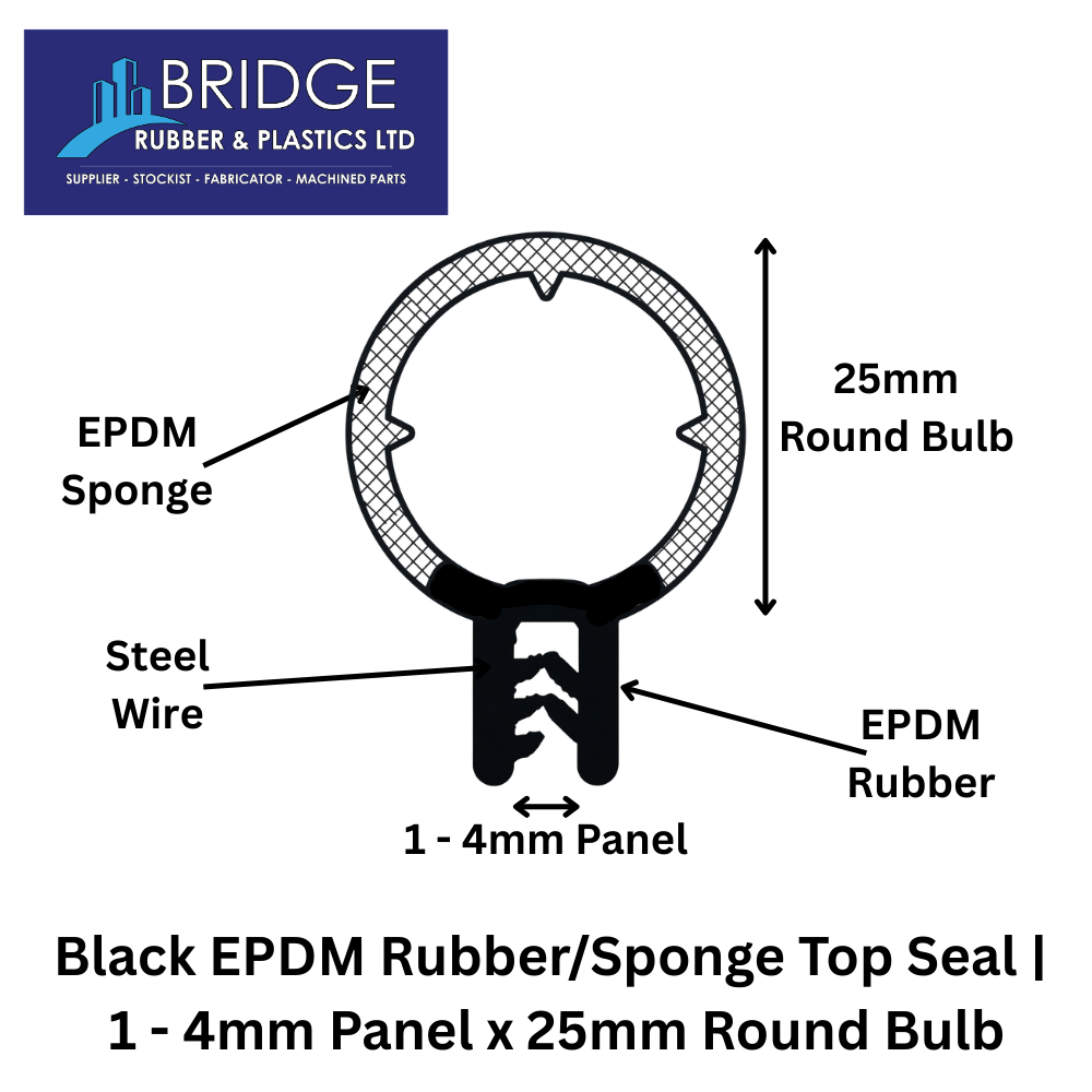 Create a strong, long lasting seal with our Black EPDM Rubber/Sponge Top Seal, designed to fit 1–4mm panel edges and featuring a 25mm round bulb for superior compression and weather resistance. This versatile profile is commonly used as a door seal, boot seal, edge seal, or hatch seal, making it ideal for automotive, caravan, marine, and general sealing applications.