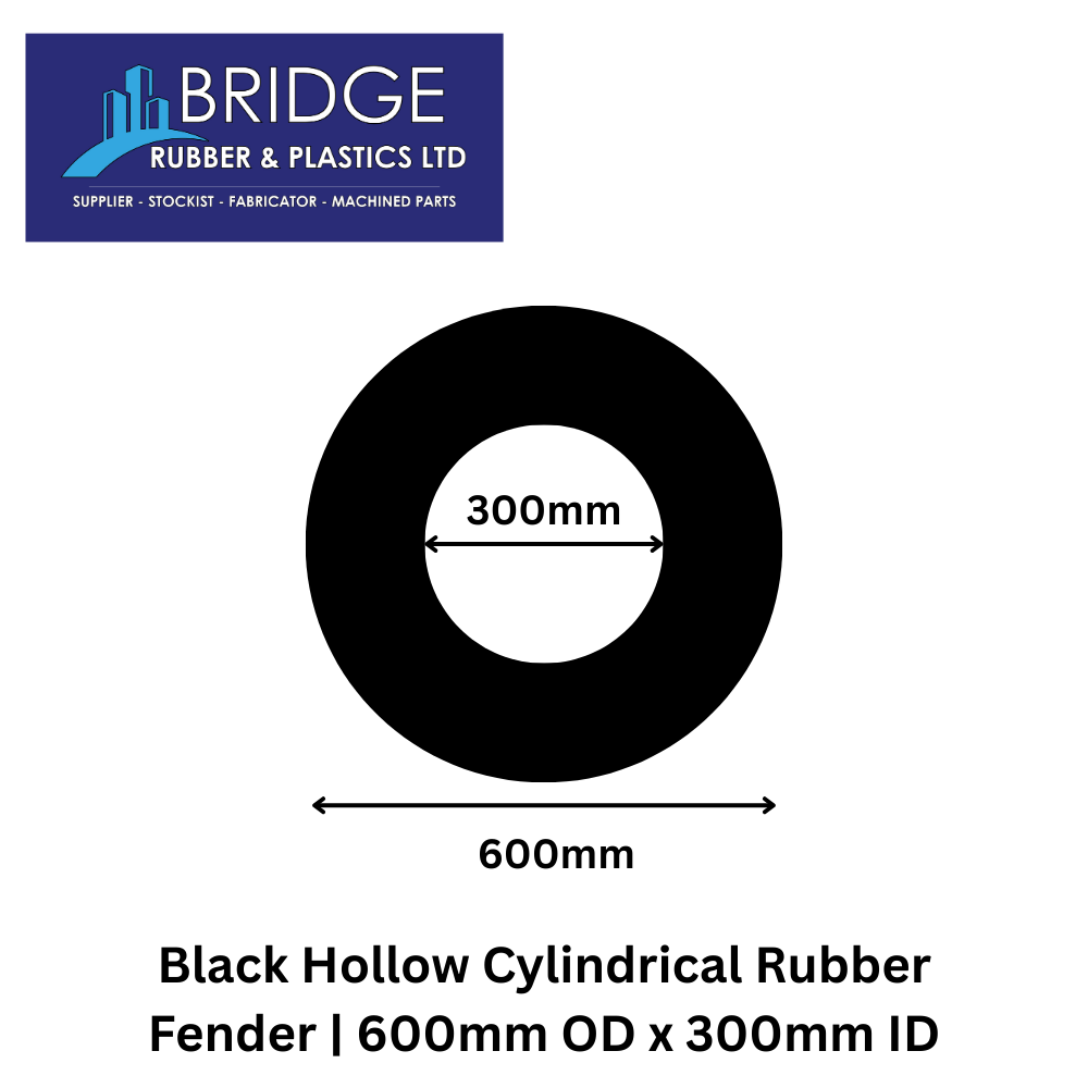 Durable Black Hollow Cylindrical Rubber Fender with 600mm outside diameter and 300mm inside diameter. Ideal for dock, boat, and industrial impact protection with excellent shock absorption.