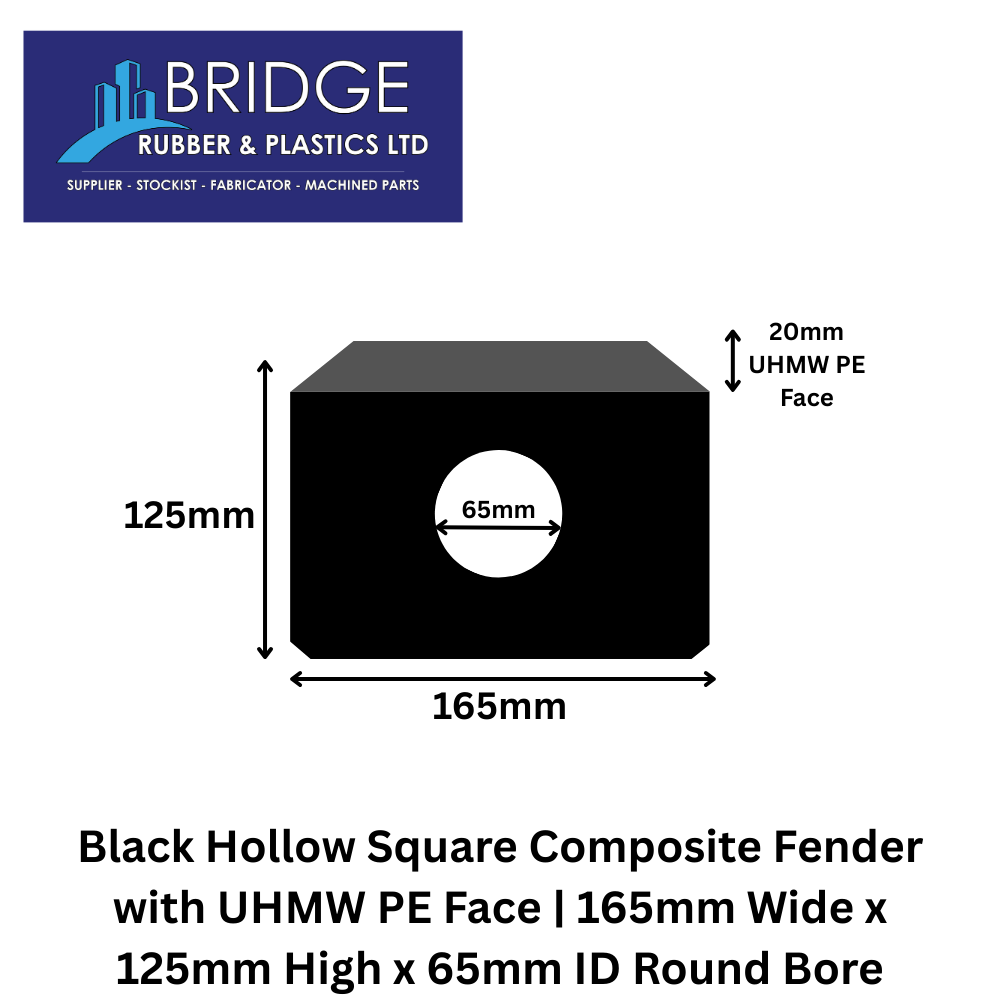 Deliver high performance impact protection with our Black Hollow Square Composite Fender with UHMW PE face, engineered for demanding marine and industrial environments. With a 165mm x 125mm square profile and a 65mm internal round bore, this fender combines excellent shock absorption with outstanding surface durability.