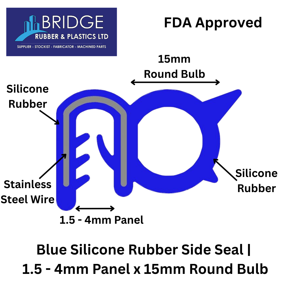 Our Blue Silicone Rubber Side Seal is designed to fit 1.5–4mm panel edges and features a 15mm round bulb for excellent compression and sealing performance. Manufactured from FDA approved silicone rubber, this seal is ideal for applications where hygiene, temperature resistance, and chemical stability are essential.