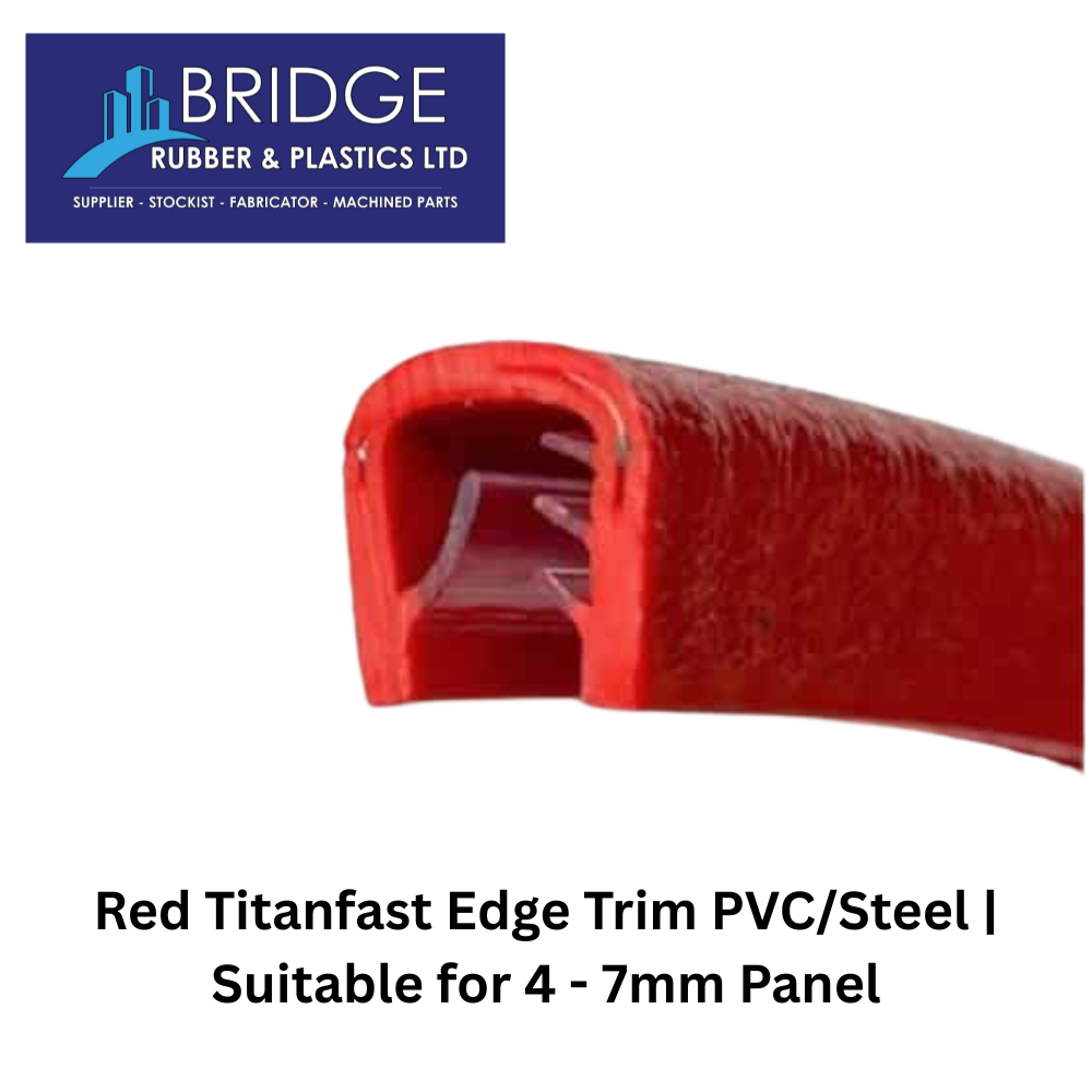 Red Titanfast edge trim with reinforced steel core and durable PVC coating. Suitable for 4 – 7mm panels, providing a secure grip and clean, professional edge protection.