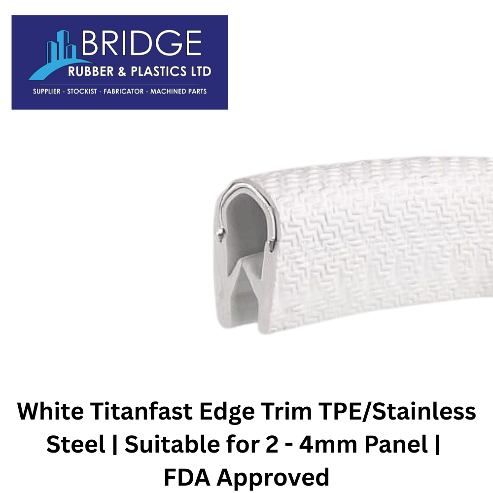 White Titanfast edge trim with reinforced stainless steel core and durable TPE coating. Suitable for 2 – 4mm panels, providing a secure grip and edge protection for food contact.
